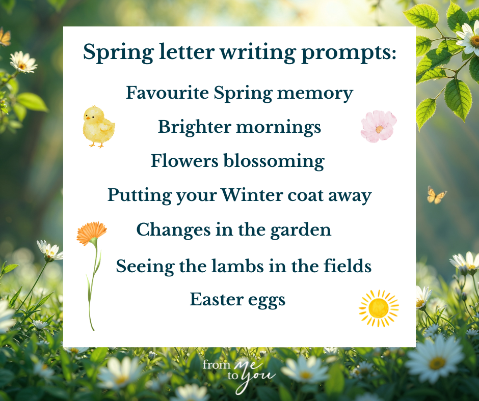 Top Tip: Write as if you're having a conversation with them. Let it flow. Add in some questions: "I wonder if you have a garden and have been watching the blossom come out like I have?" or "Do you have a favourite Easter tradition?" or "What's your favourite spring memory?"